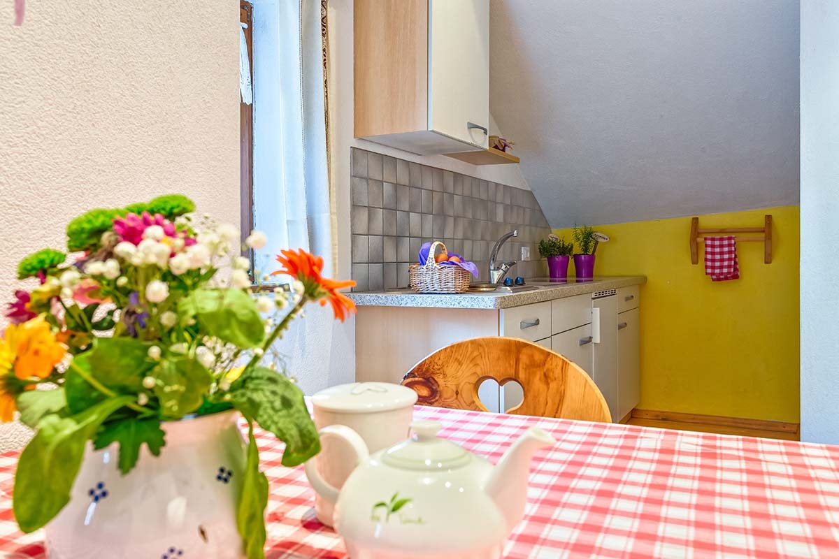 Kuschelige Ferienwohnung unterm Dach für eine Auszeit zu zweit! Der Ausblick ist in den Wald, wo die Fichten für die Möbel gewachsen sind. Nach einem ausgefüllten Tag in der herrlichen Natur bietet die herzlich dekorierte Wohnung Platz für Zweisamkeit.